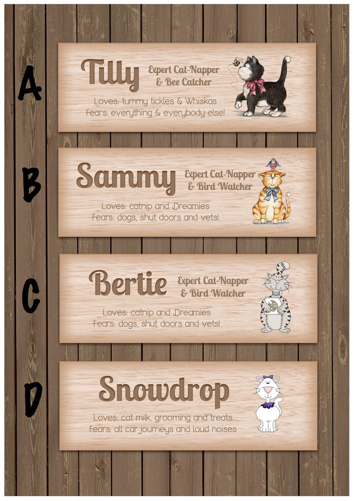 A name plaque for your cat is perfect for his/her basket at home or to put on the carrier for those occasional vet visits.  Let us know the name and text you want on your sign; for example include information a vet or visitors may find useful, such as likes and dislikes as shown in picture, or a humorous quotation.  Let us know the text you would like in the box above (drag corner to enlarge box), or in the 'Notes to seller' option at check-out.
