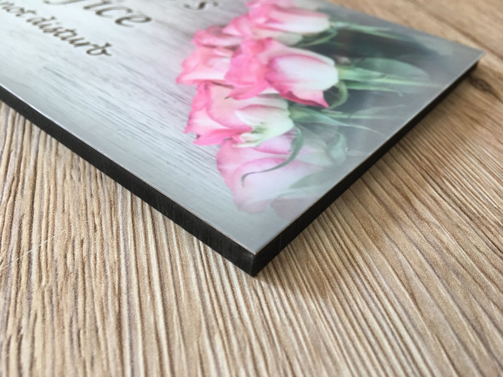 The thicker and heavier, square cornered wood sign is made of dark brown HDF with a glossy front showing the colourful design. It is 0.5cm thick.