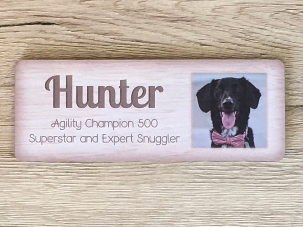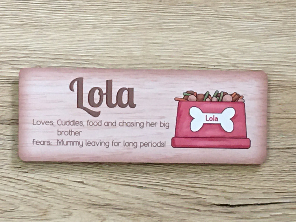 A name plaque for your dog is perfect for his/her basket or kennel at home or to put on the carrier for those occasional vet visits. Let us know the name and text you want on your sign; for example include information a vet or visitors may find useful, such as likes and dislikes as shown in picture, or a humorous quotation. Let us know the text you would like in the box above (drag corner to enlarge box), or in the 'Notes to seller' option at check-out.