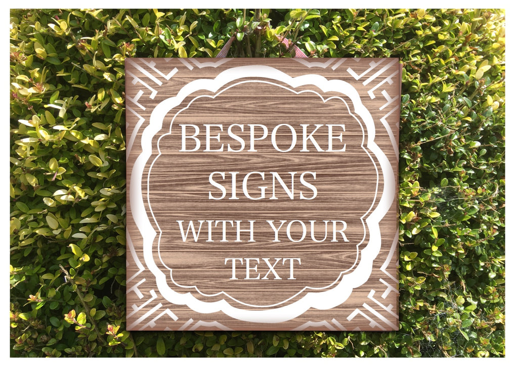 A custom-made sign with your own text in metal or wood. Just let us know the text you want in the text box above. We have included pictures with some ideas. If you want more than one sign with different text add them individually to your basket, otherwise all the signs will be done the same.