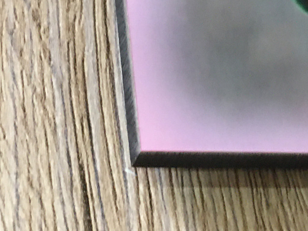 The thicker and heavier, square cornered wood sign is made of dark brown HDF with a glossy front showing the colourful design. It is 0.5cm thick.  The drop-down for the attachments show that you have a choice between: sticky pads, hanging cord, picture hook, magnet or no attachment.