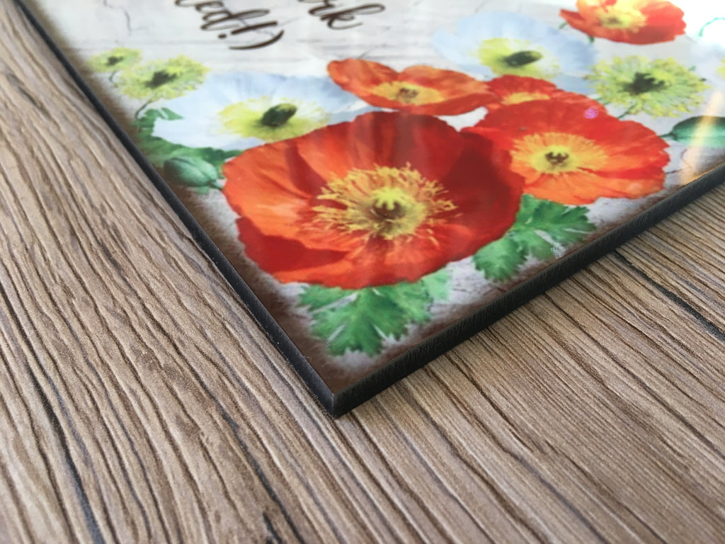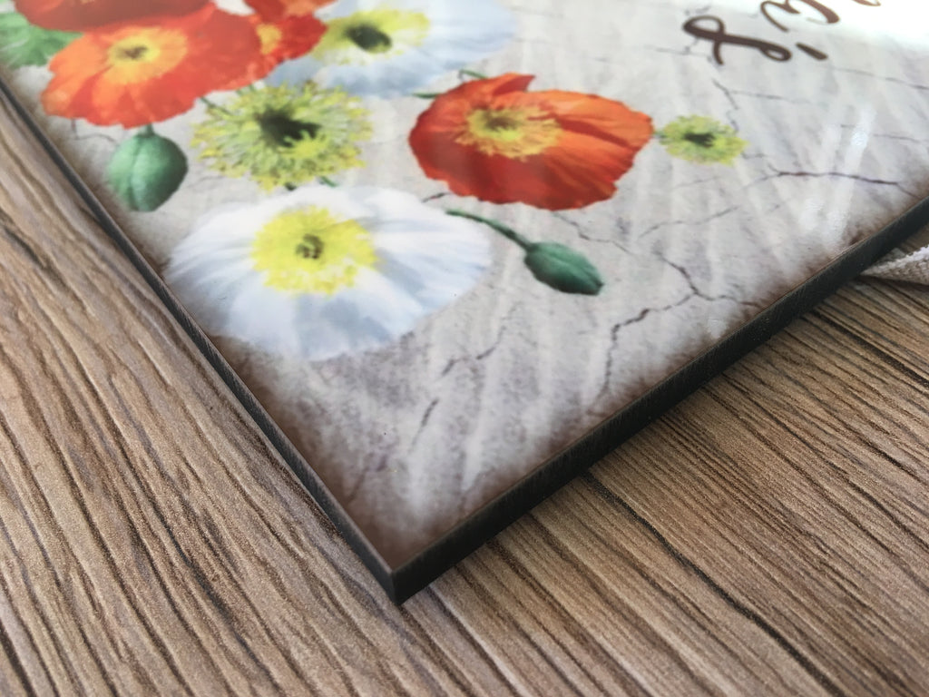 The thicker and heavier, square cornered wood sign is made of dark brown HDF with a glossy front showing the colourful design. It is 0.5cm thick.