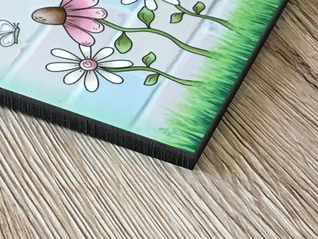 WOOD SIGN - The thicker and heavier wood sign is made of dark brown HDF with a glossy front showing the colourful design and square corners.