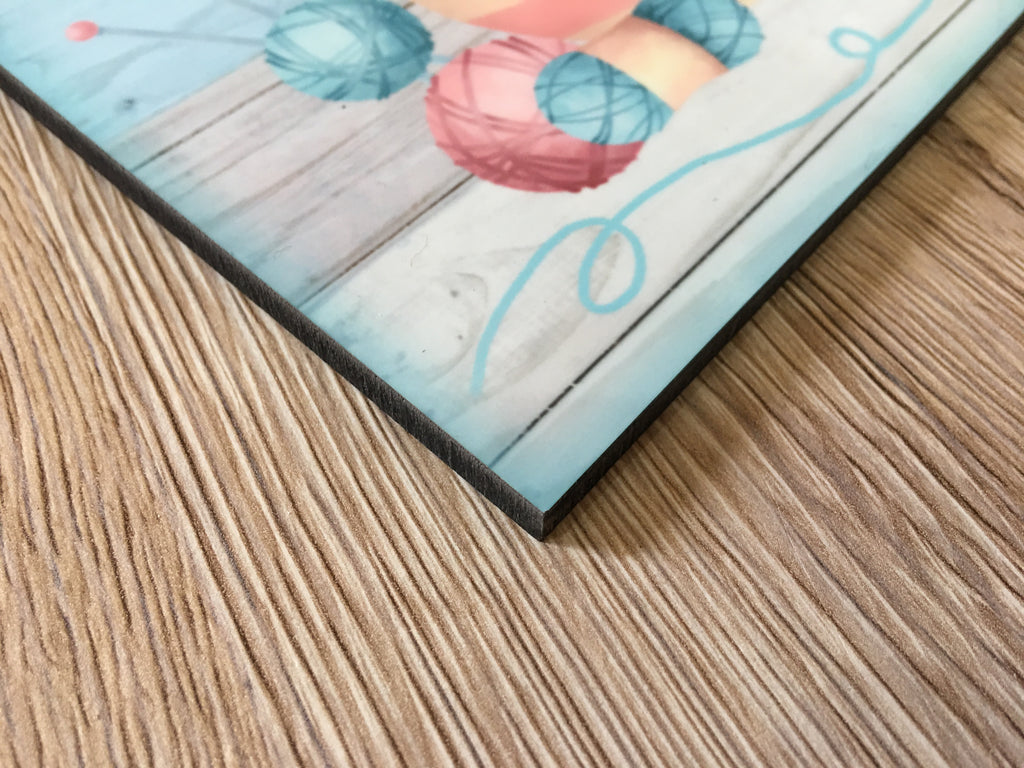 WOOD SIGN - The thicker and heavier wood sign is made of dark brown HDF with a glossy front showing the colourful design and square corners.