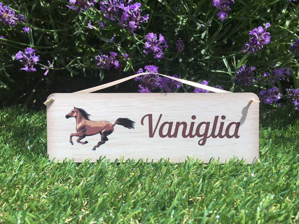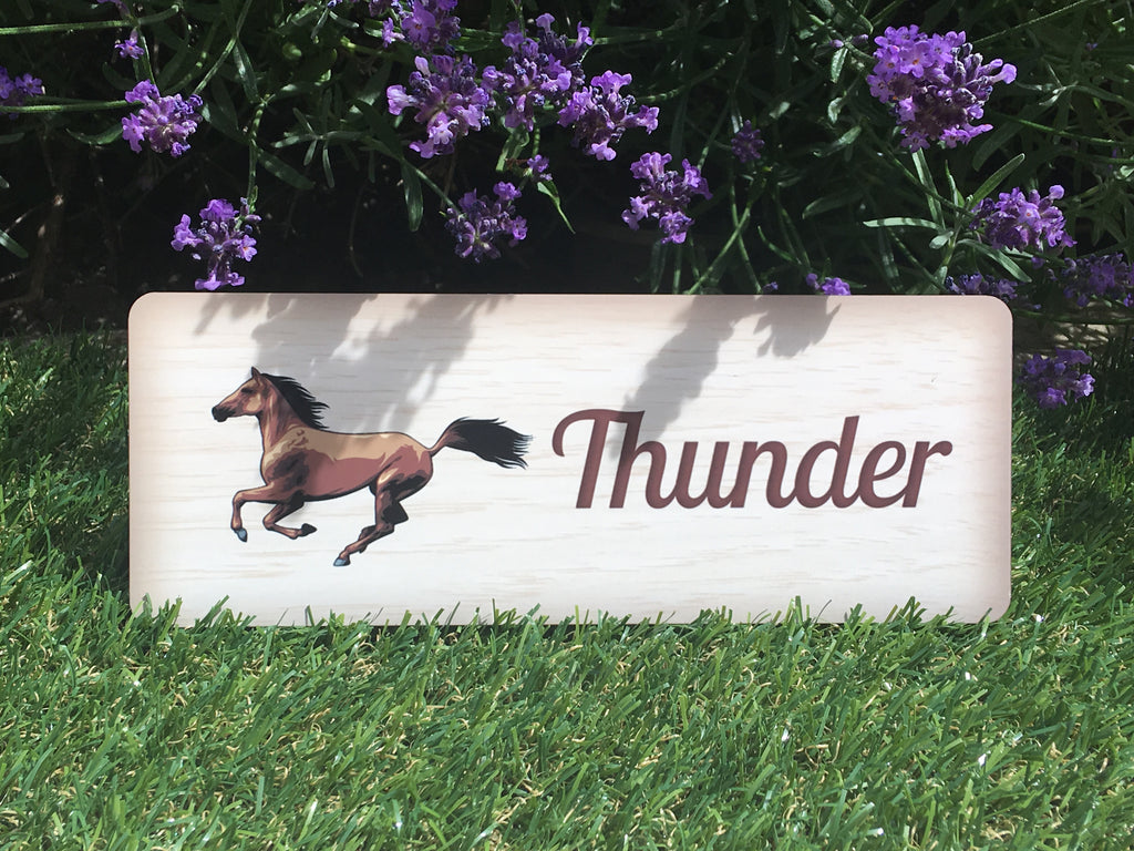 This design is also available in a brushed silver, gold or white design at: https://www.honeymellow.com/products/horse-sign-personalised-metal-stables-plaque