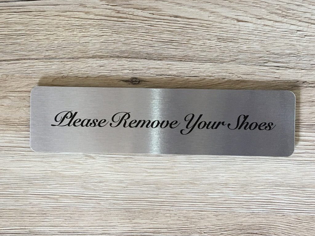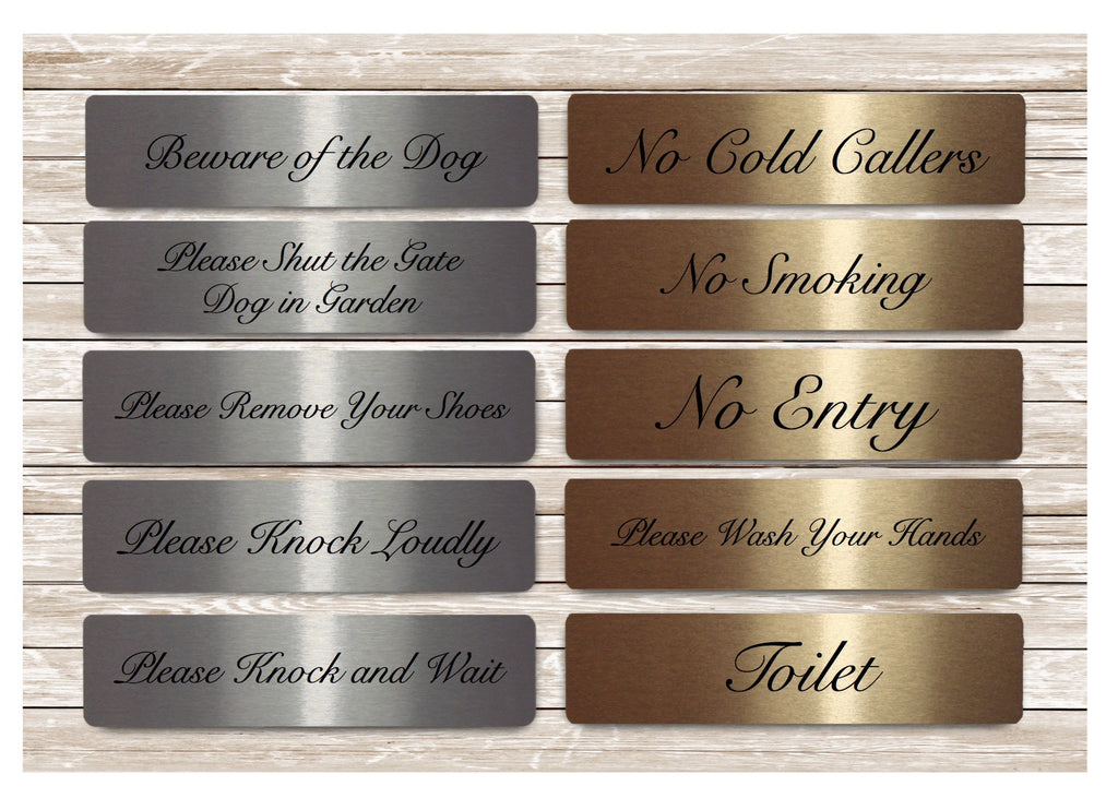 Each sign is made of light aluminium which is known for its rust-free qualities. The brushed silver or brushed gold gives a glossy finish, making it both an attractive and functional accessory. Simply attach with the enclosed weather-proof sticky pads or for a flush finish, use a small amount of strong glue. No nails needed.