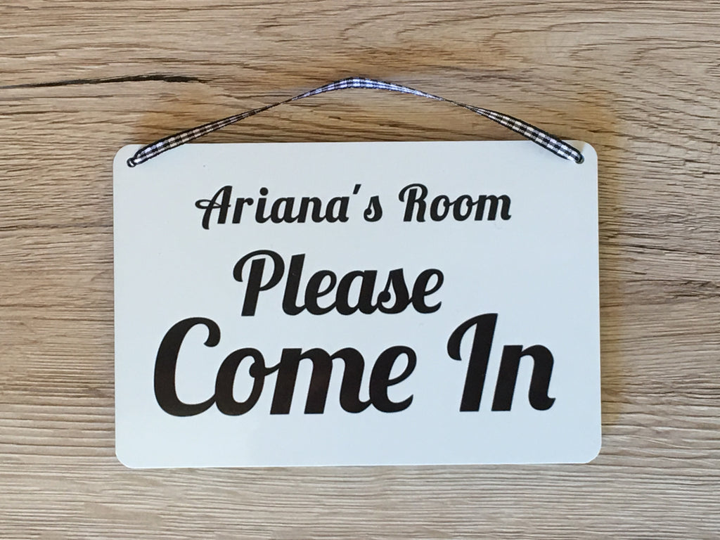 These reversible signs have two holes put in the top corners and a hanging ribbon.