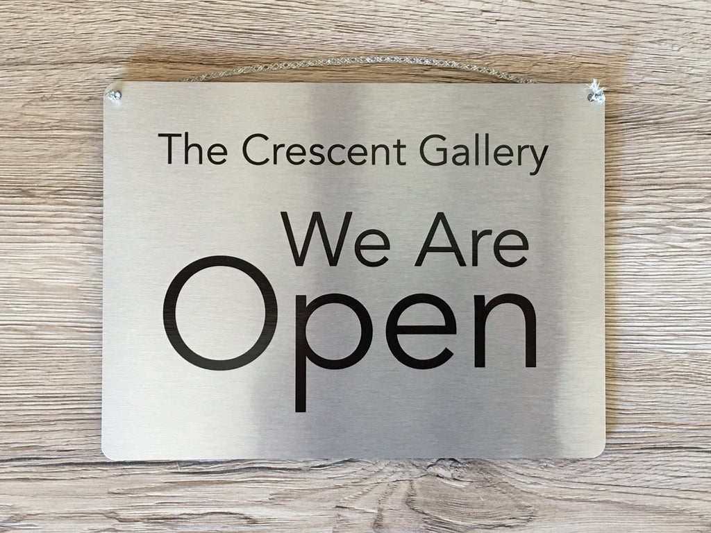 Open and Closed Reversible Italic Hanging Metal Signs in Silver, Gold or White