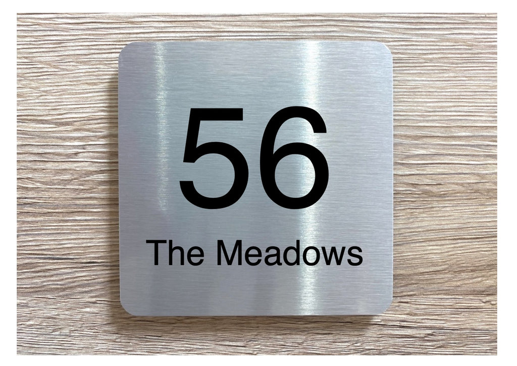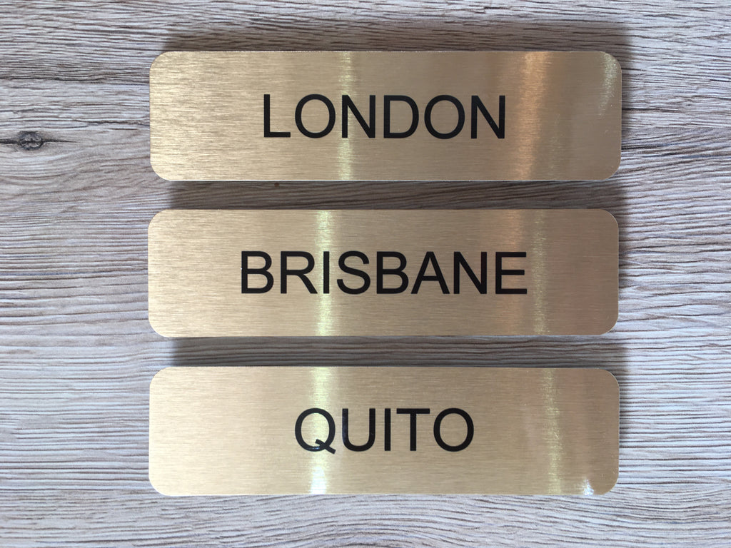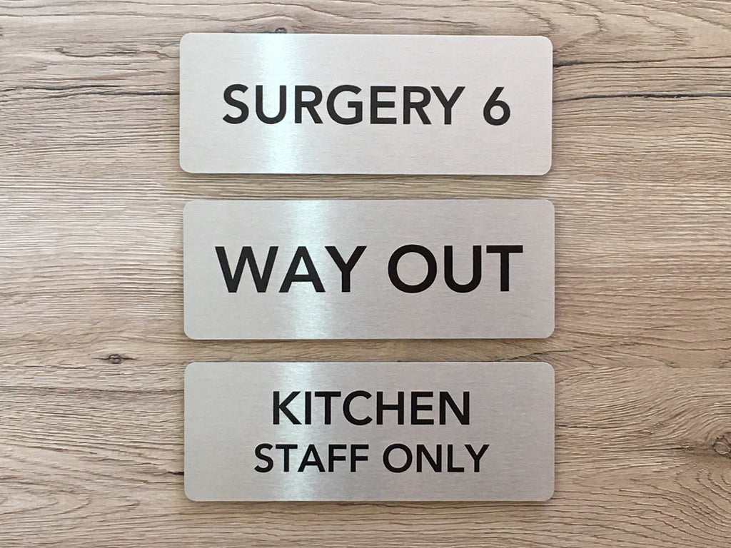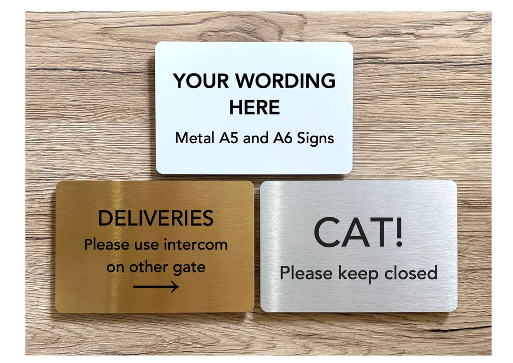 The signs come in various sizes and with fitting options: Small 15x5cm / 6"x2" Medium 20x5cm / 8"x2" Large 20x7.5cm / 8"x3" Oblong 15x10cm / 6"x4" A4 (approx) 28x20cm / 11"x8" (silver only) A5 (approx) 20x15cm / 8"x6"(white and brushed silver only) Round 9cm / 3.5" Diameter Square 9cm / 3.5" (white and brushed silver only) Square 10cm/4" Square 15cm / 6" (white and brushed silver only) Mini Oblong 13 x 3.5cm / 5x1.5" (silver and gold only) Business Card 8.4x5.4cm/3.3x2.1 Label 3.5x8.5cm 1.3x3.3"
