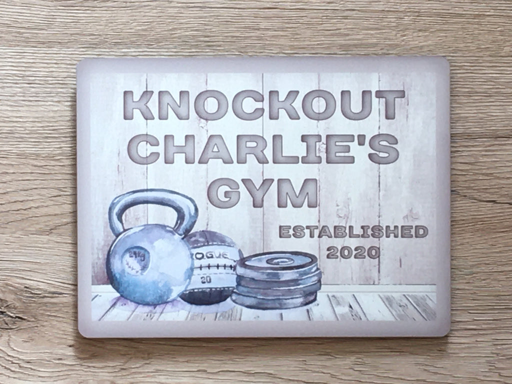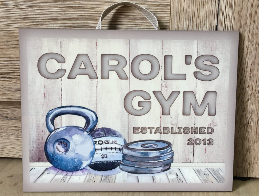 You can change as much or as little of the text on the plaque. For example include make it personalised by including a name or change the wording to 'fitness studio' - the choice is yours. Just let us know what you want in the 'Wording for Sign' box above. (The box will expand to fit your text and you will not be able to order unless this box is completed).